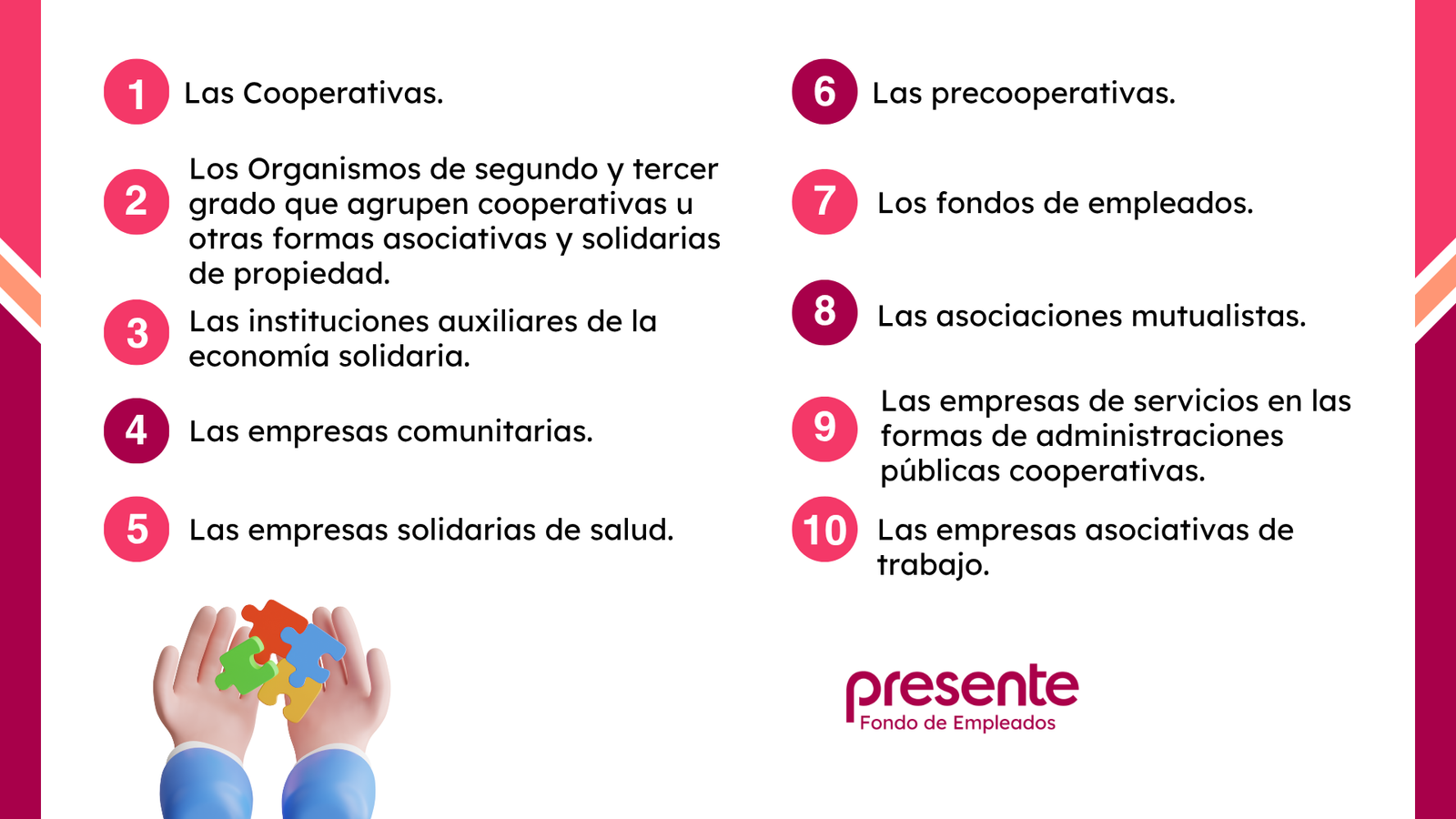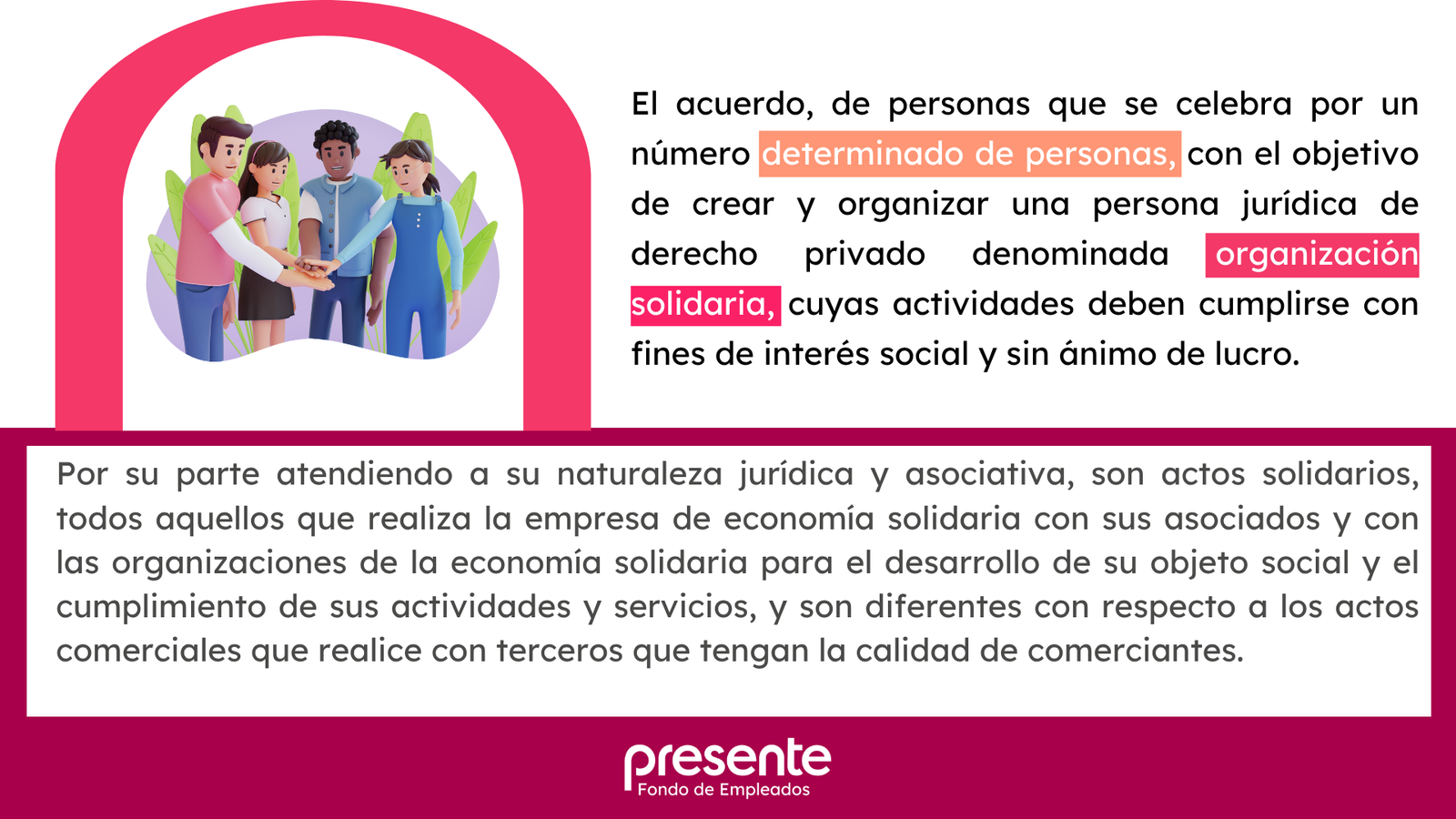 Son un conjunto de organizaciones que siendo de iniciativa privada, desarrollan fines de beneficio colectivo o social y no tienen como fundamento el enriquecimiento o la posesión y crecimiento del capital económico de las personas consideradas individualmente, que crecen como empresas en el propósito de generar bienestar de diversa índole a sus asociados. Dichas organizaciones tienen como principios comunes la libre adhesión, la democracia, la ausencia de ganancia individual, el desarrollo de la persona natural y la independencia total frente al Estado.