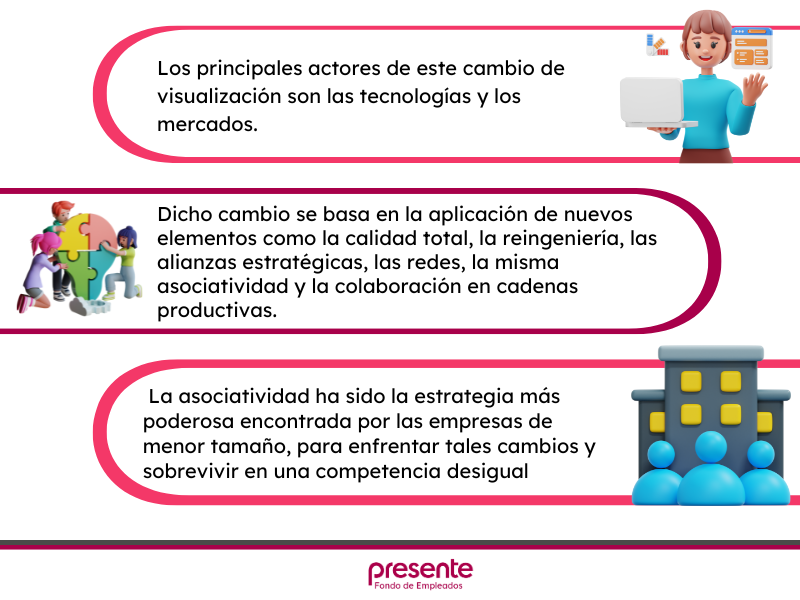 La asociatividad se define como aquella forma de romper con viejos paradigmas en los que se deja de mirar hacia afuera y se esquematiza la interiorización de las empresas como factor de asociación, con el fin de generar variaciones en la producción, organización y comercialización de bienes y servicios.
