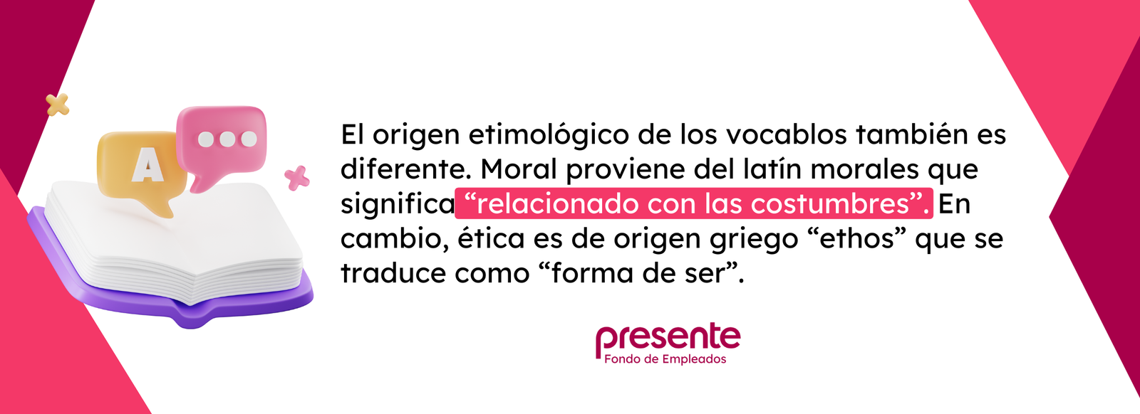 Generalmente la ética tiende a confundirse con la moral, no obstante, su significado es diferente. De un lado, la moral conforma el marco básico en un nivel práctico del comportamiento personal, influyendo en las normas de conducta de las personas. Mientras que la ética, versa su estudio conceptual sobre los valores morales, no desde el punto de vista de su génesis sino desde el modo de actuar de las personas ante la sociedad.