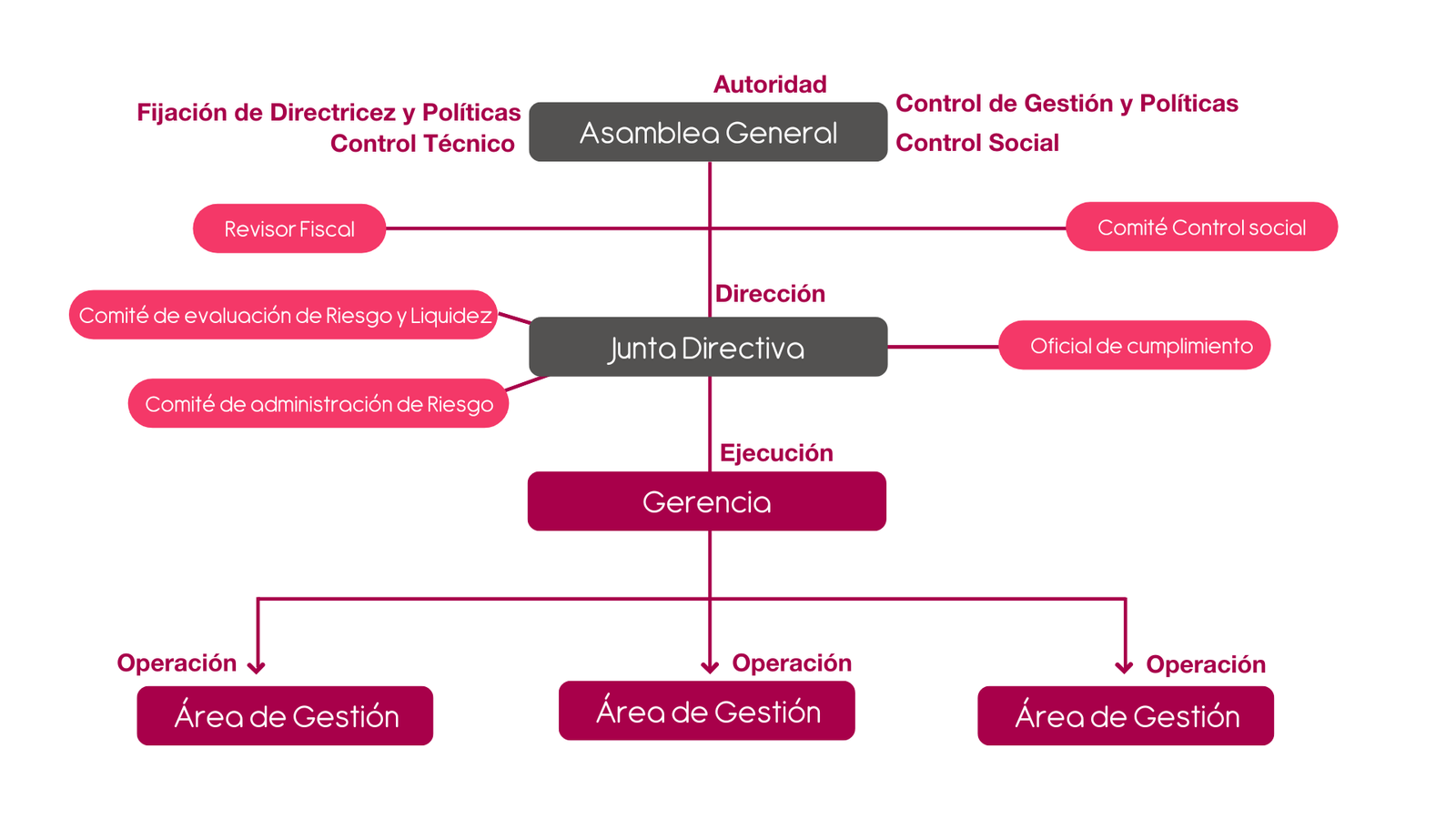 Dentro de los órganos de administración de la cooperativa se encuentra: La Asamblea General, el Consejo de Administración y la Gerencia, un organigrama puede ser el siguiente: