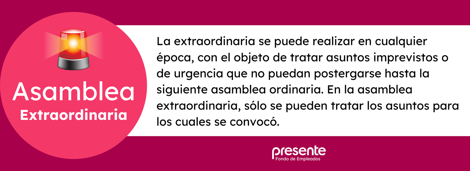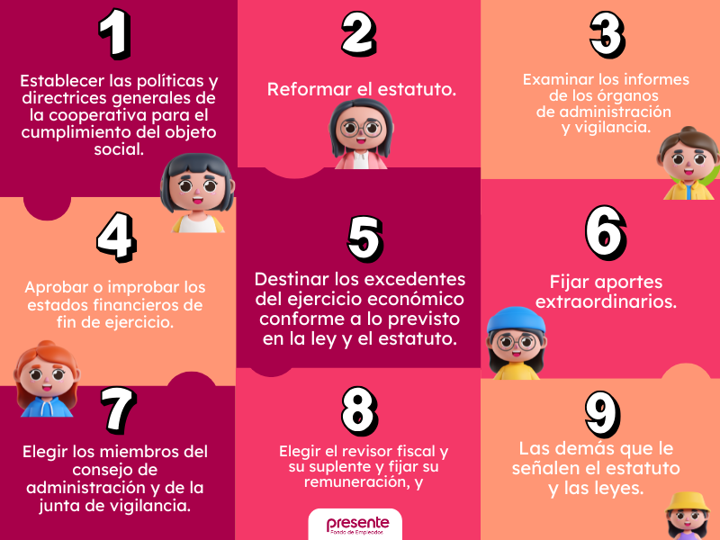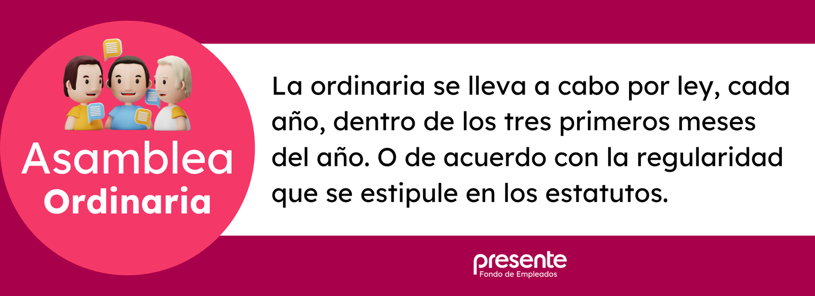 La asamblea general es el órgano máximo de administración de las cooperativas y sus decisiones son obligatorias para todos los asociados, siempre que se hayan adoptado de conformidad con las normas legales, reglamentarias o estatutarias. La constituye la reunión de los asociados hábiles o de los delegados elegidos por éstos. Las asambleas pueden ser Ordinarias y Extraordinarias.