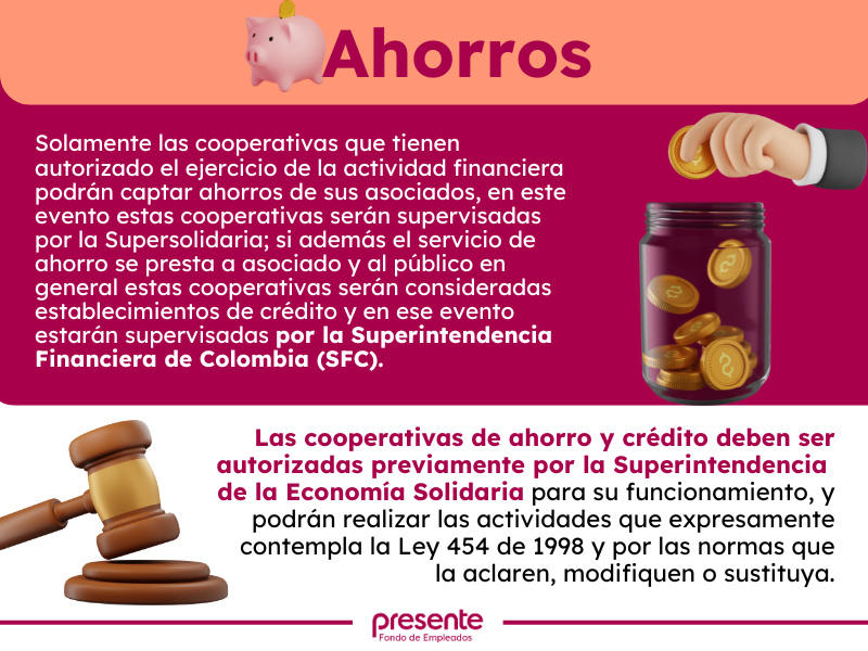 De acuerdo con la legislación vigente los tipos de cooperativas son 5, y dependiendo de la actividad que realizan tiene vigilancia especializada con la Superintendencia de Economía Solidaria, Superintendencia de Servicios Públicos, Superintendencia Financiera, Superintendencia de Puertos y transporte y Superintendencia de Salud.